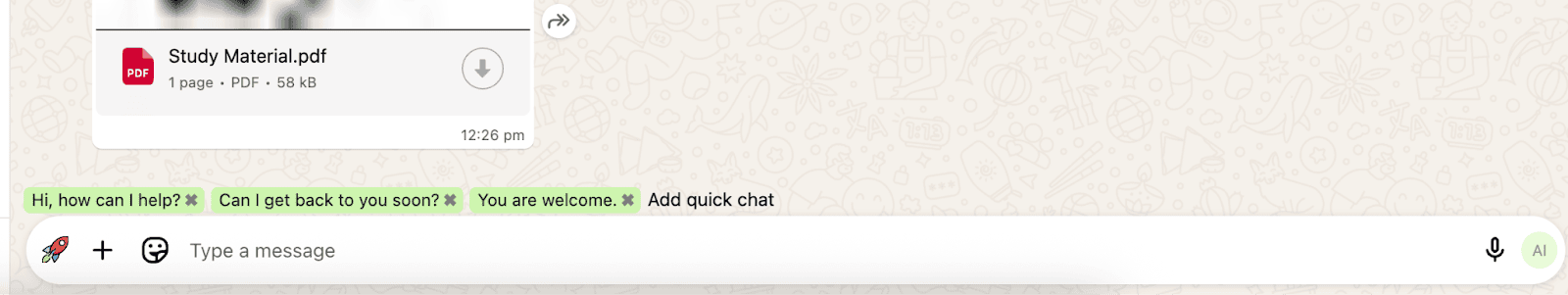 Abre cualquier conversación de WhatsApp en tu navegador y haz clic en el botón "Añadir chat rápido" sobre el cuadro de mensaje. Aquí puedes añadir fragmentos de mensajes personalizados que uses con frecuencia.