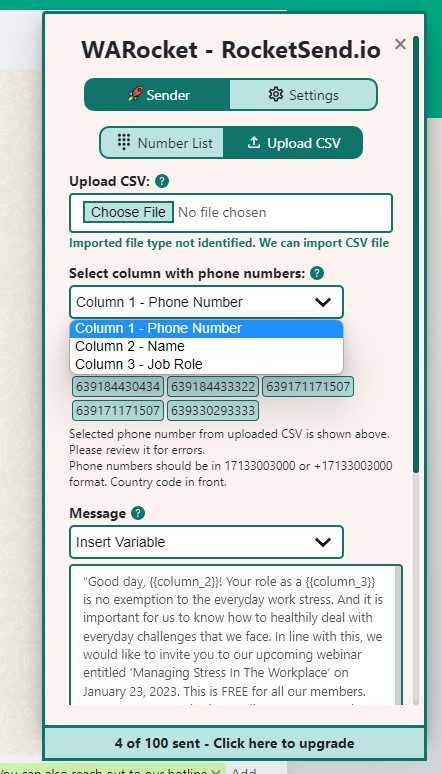 Rocketsend.io will send messages one by one according to the mapped column where it should get the phone numbers to use. To properly map the phone numbers for the message sending, click the dropdown for Select column with phone numbers, and select the column where the phone numbers are prepared earlier.