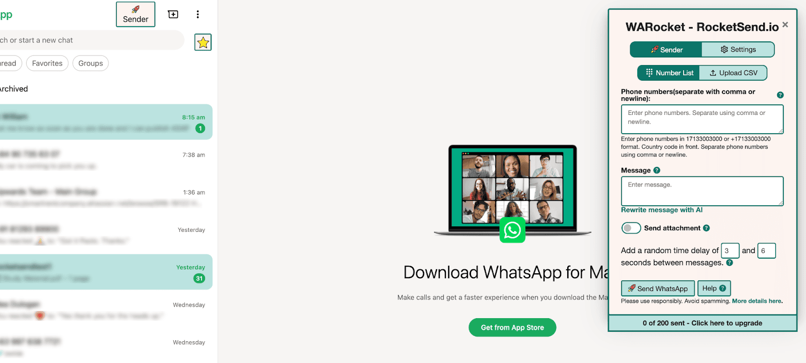 - Para um toque mais humano, ative atrasos de envio opcionais nas configurações para espaçar as mensagens, imitando o ritmo natural da conversa. A interface simplificada do RocketSend mantém você totalmente dentro do WhatsApp Web, facilitando a execução da campanha.