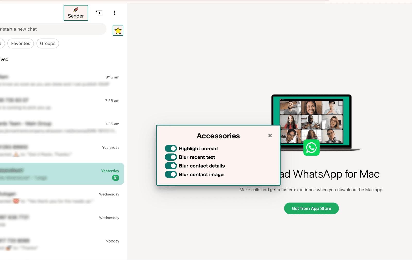 Abra o WhatsApp Web e abra o painel rocketsend.io clicando no ícone de estrela ★ no canto superior esquerdo. Ative Desfocar texto recente,Desfocar detalhes de contato, ou Desfocar imagem de contato no menu Acessórios para mascarar itens sensíveis instantaneamente.